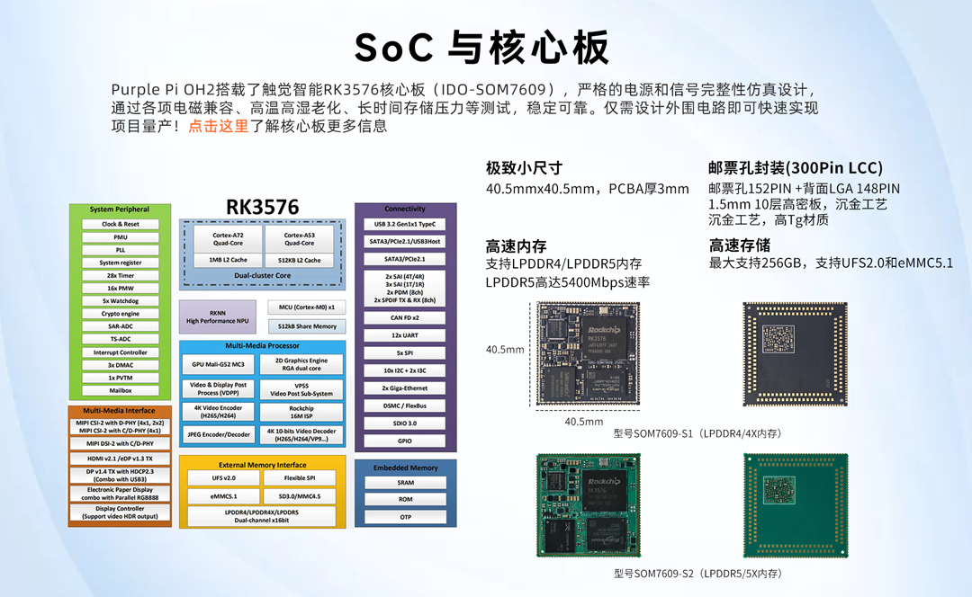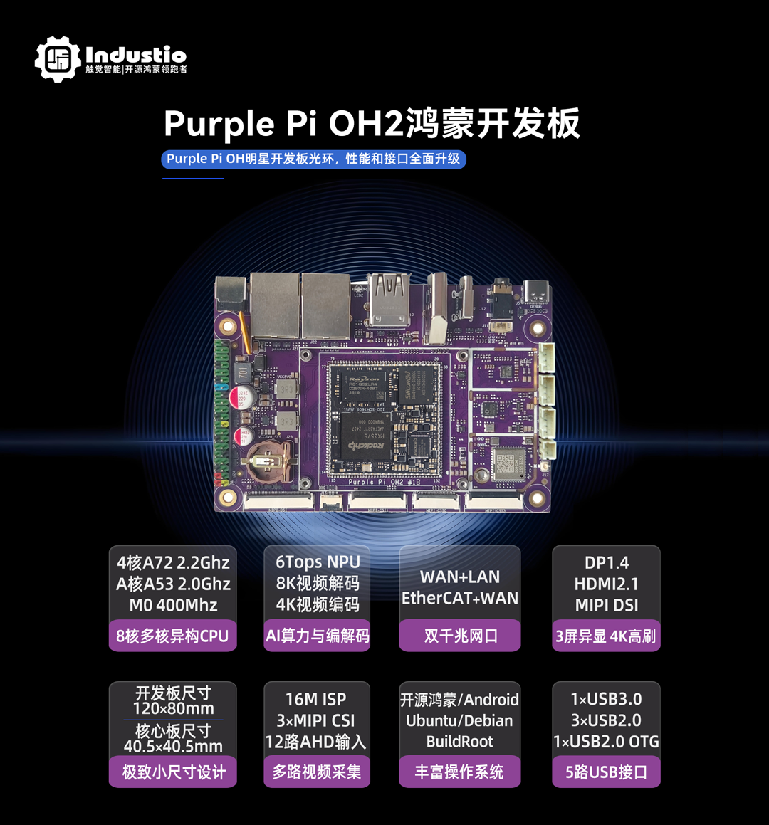 深圳触觉智能Purple Pi OH2鸿蒙开发板开售!搭载瑞芯微RK3576高性能AIOT多核异构处理器(4核A72+4核A53+M0,主频最高2.2GHz);继承明星开发板光环,8核+6Tops算力,性能、接口、功能全方位升级!配套RK3576核心板(邮票孔封装,40.5×40.5mm极致小尺寸),全新LPDDR5高速内存支持。