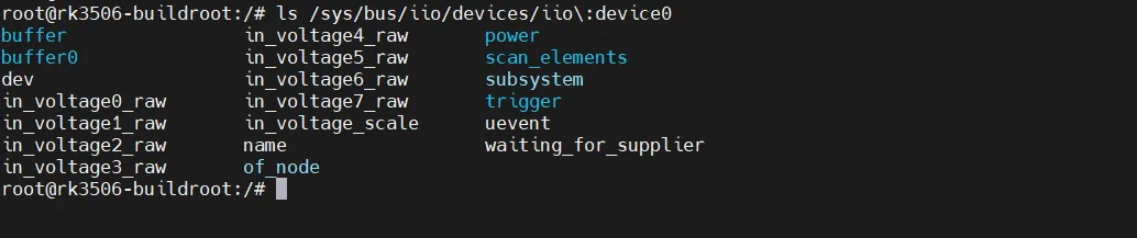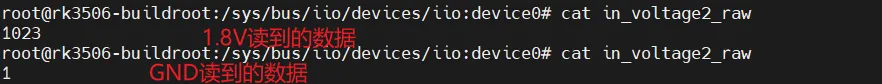 上电进入系统后,通过用户态接口获取ADC值,因RK3506最高支持4路SARADC通道,即in_voltage0_raw ~ in_voltage3_raw为有效通道,分别对应SARADC_IN0 ~ SARADC_IN3: