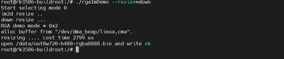 rgaImDemo --resize=uprgaImDemo --resize=down参数说明:up :图像分辨率放大至1920x1080down :图像分辨率缩小至720x480