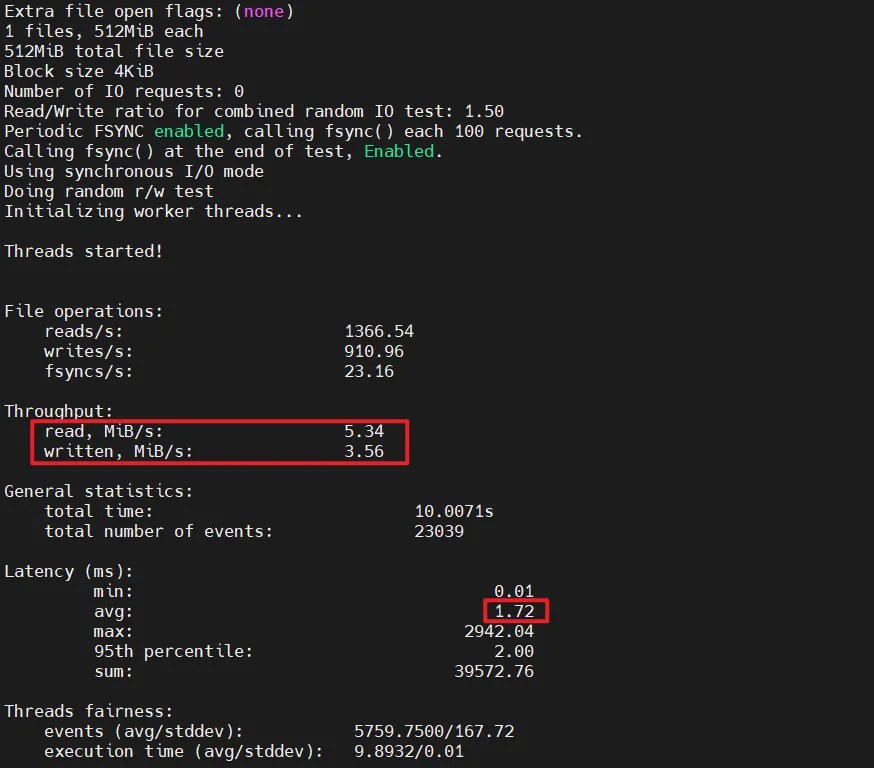./sysbench --test=fileio --file-total-size=512M --file-num=1 --file-test-mode=rndrw --file-block-size=4K --file-io-mode=sync --num-threads=4 run