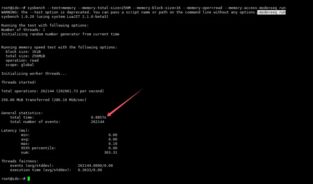 root@ido:/# sudo apt-get update root@ido:/# sudo apt-get install sysbench root@ido:/# sysbench --test=memory --memory-total-size=256M --memory-block-size=1K --memory-oper=read --memory-access-mode=seq run