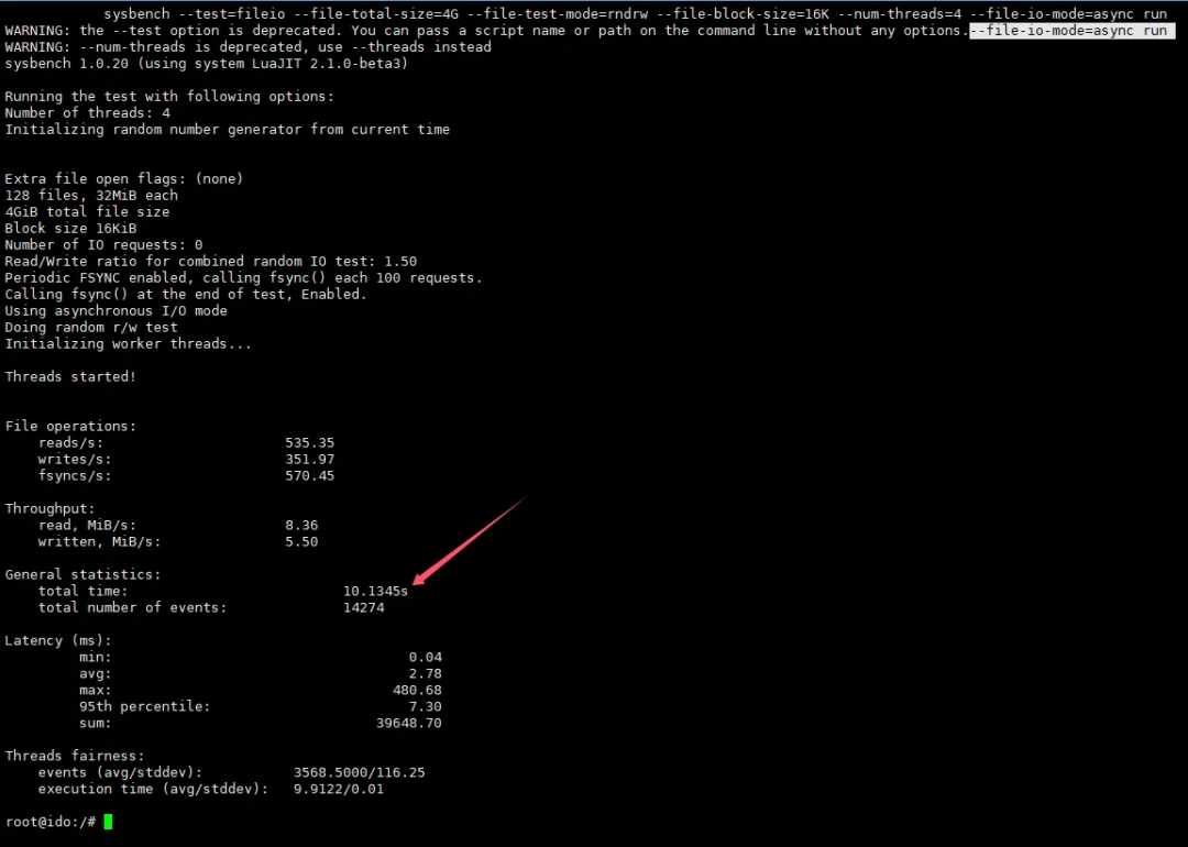 root@ido:/# sudo apt-get update root@ido:/# sudo apt-get install -y stress-ng root@ido:/# sysbench --test=fileio --file-total-size=1G --file-test-mode=rndrw --file-block-size=4K --file-io-mode=async prepare root@ido:/# sysbench --test=fileio --file-total-size=1G --file-test-mode=rndrw --file-block-size=4K --file-io-mode=async run