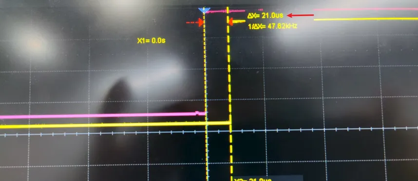 红色信号为GPIO1,黄色信号为GPIO2,示波器实测中断延迟为:21us。