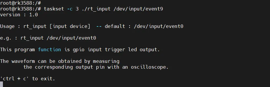完成交叉编译应用程序后,执行测试程序等待接收触发信号,硬件使用示波器捕获触发信号。