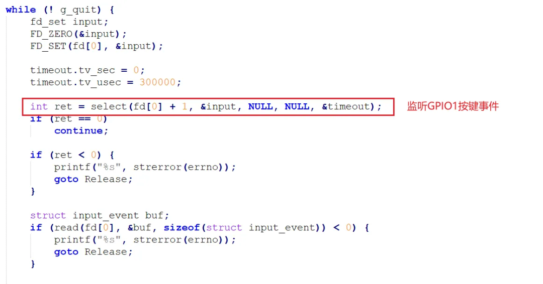 例程通过创建一个基本的实时线程,在线程内实现打开GPIO1对应的按键input设备并对按键事件进行监听从而触发GPIO2对应的LED的亮灭控制: