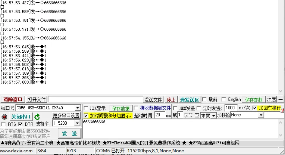 电脑端打开sscom串口工具并设置好COM端口号(在电脑的设备管理器查看端口号)和波特率(115200)后打开如下: