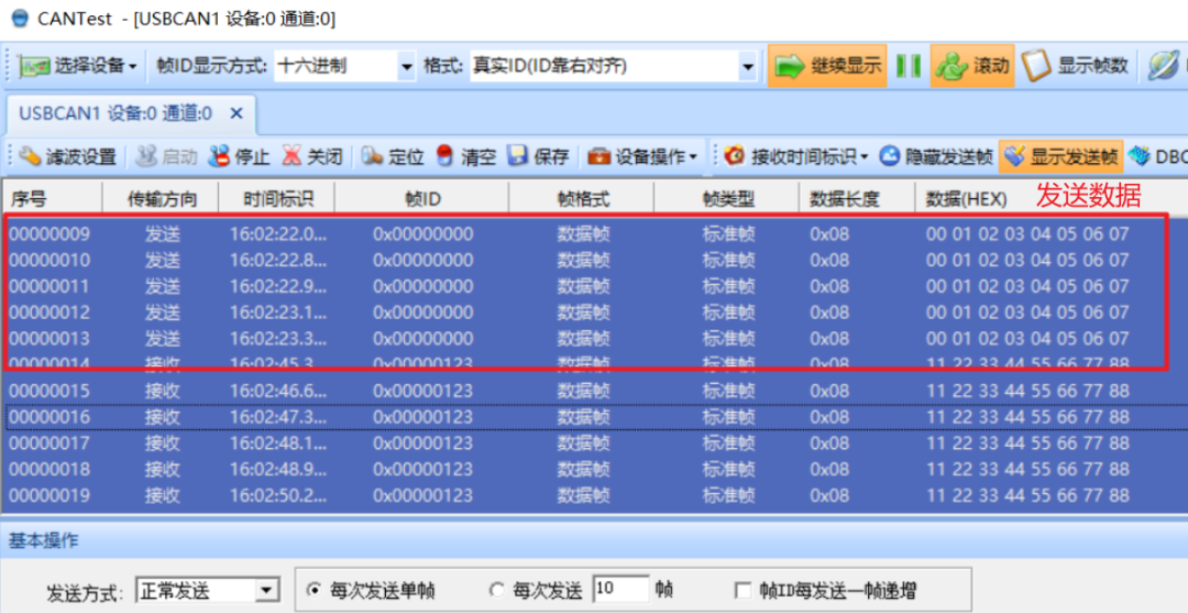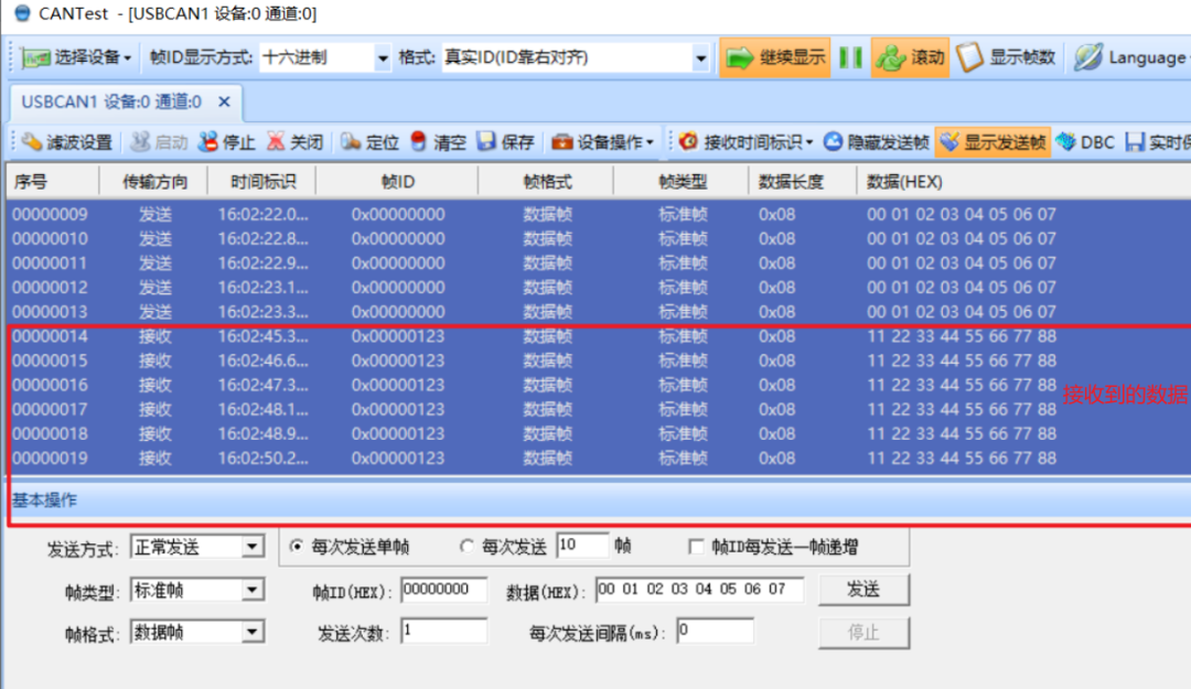 发送数据后在接收端(CANTest工具)查看是否接收到对应的数据: