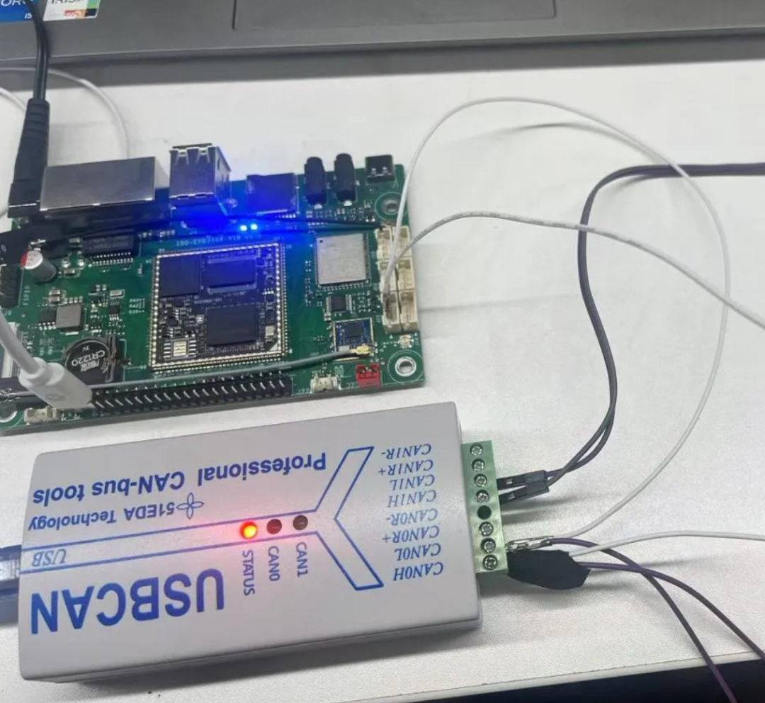 将触觉智能RK3506开发板的CAN1节点与CAN USB连接(H对H,L对L),另一端与电脑usb接口连接,硬件接线如下图所示: