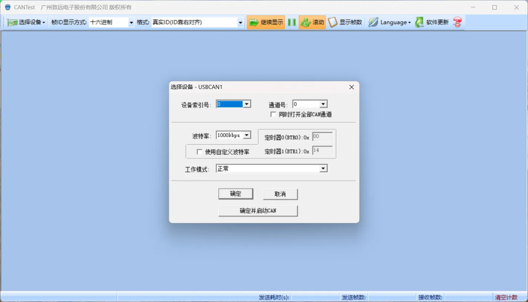 CANTest的CAN USB 测试工具,在Windows端下载并解压CANTest 工具,然后启动测试工具后点击选择USBCAN1 并设置波特率(1Mbps),其他参数默认即可。