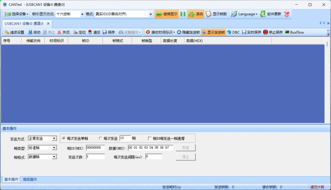 完成后在发送端(CANTest工具)查看开发板是否接收到对应的数据。同样配置1Mbps。