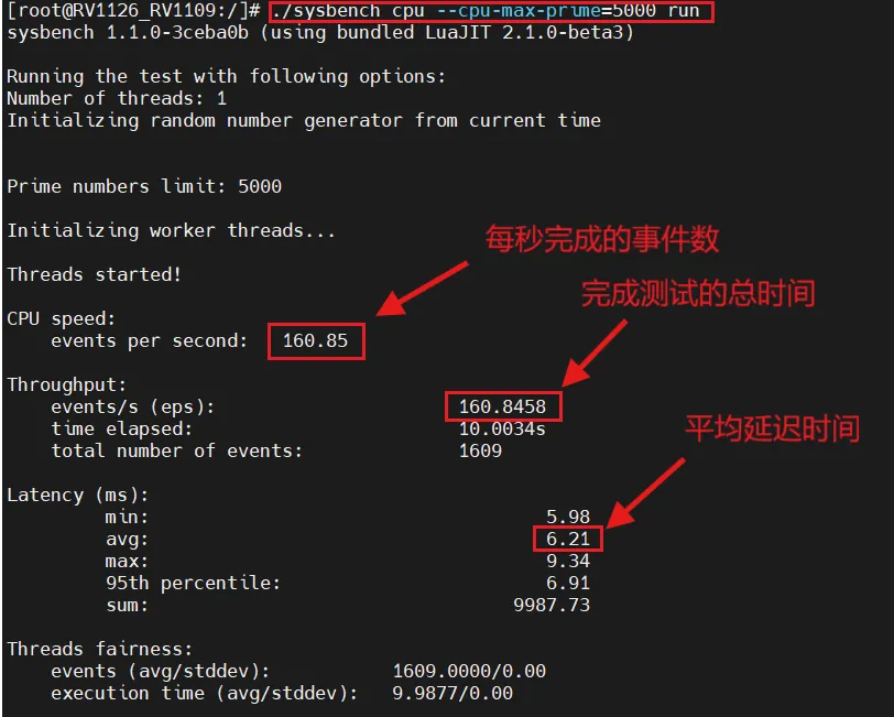 -- cpu-max-prime=5000:这是CPU测试的一个参数,表示计算素数的上限为5000。也就是说,在测试中,sysbench会计算从2到5000之间的所有素数。这个值越大,计算量就越大,测试时间也会越长。