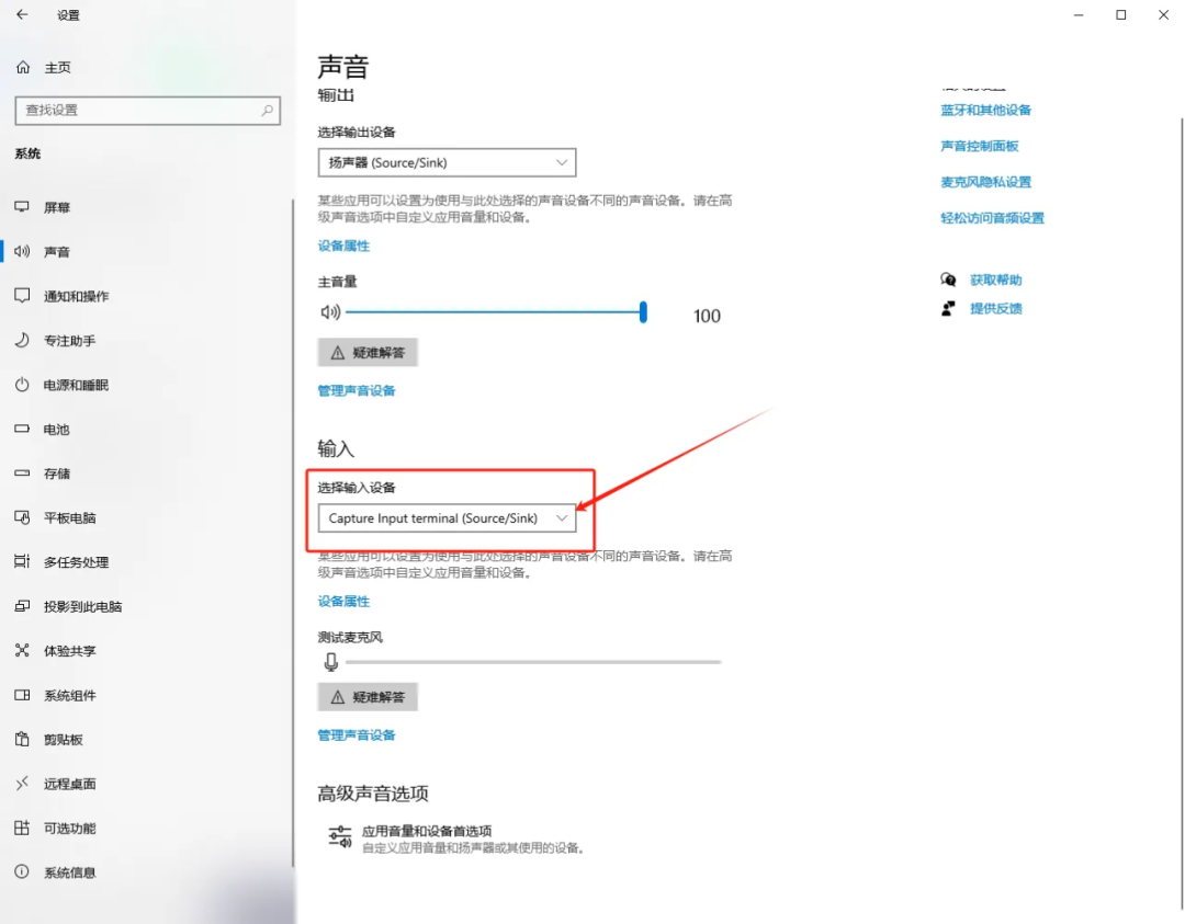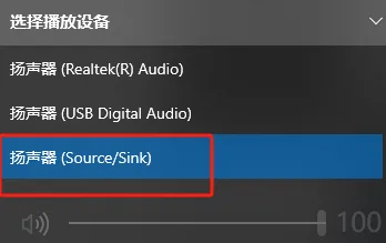 PC端:选择输出设备,选中Device设备(⼀般识别为Source/Sink,设备名与Windows版本相关) , 并打开播放器,播放⾳乐。