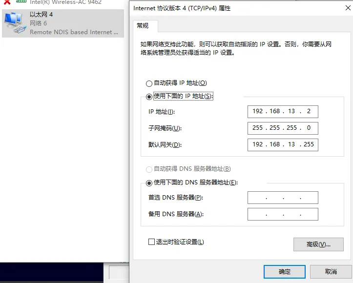 将PC和板端新识别出的网卡手动配置于同一网段(192.168.13.X):