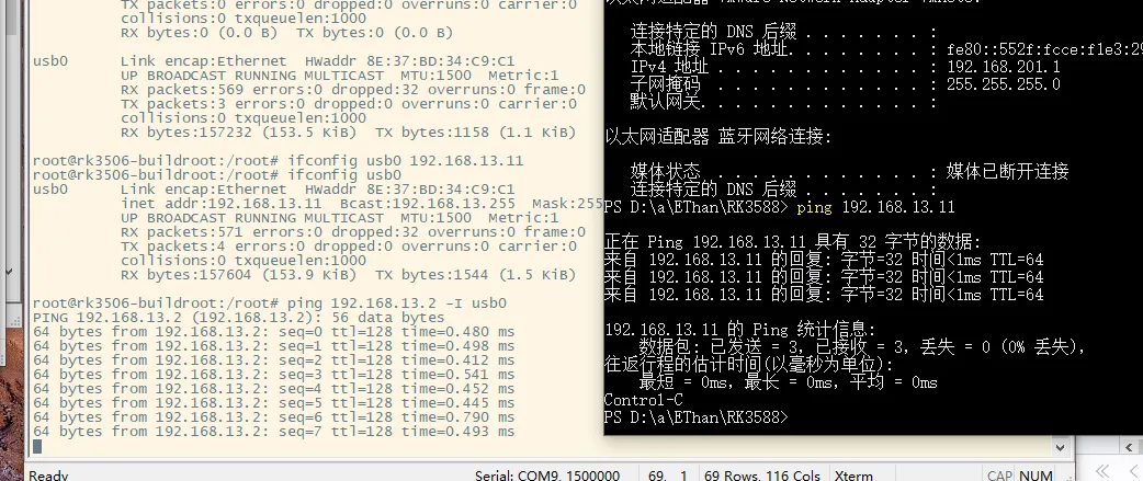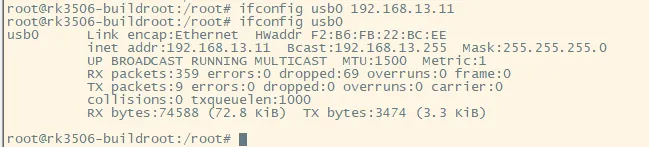 root@rk3506-buildroot:/root# ifconfig …… usb0 Link encap:Ethernet HWaddr F2:B6:FB:22:BC:EE UP BROADCAST RUNNING MULTICAST MTU:1500 Metric:1 RX packets:359 errors:0 dropped:69 overruns:0 frame:0 TX packets:5 errors:0 dropped:0 overruns:0 carrier:0 collisions:0 txqueuelen:1000 RX bytes:74588 (72.8 KiB) TX bytes:1930 (1.8 KiB)