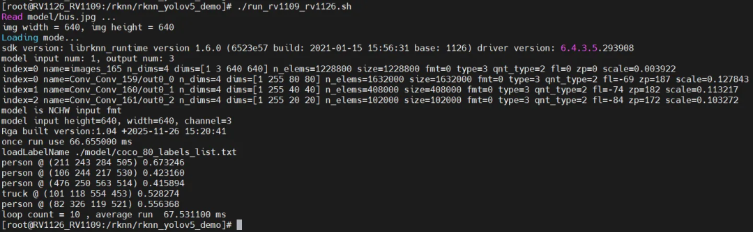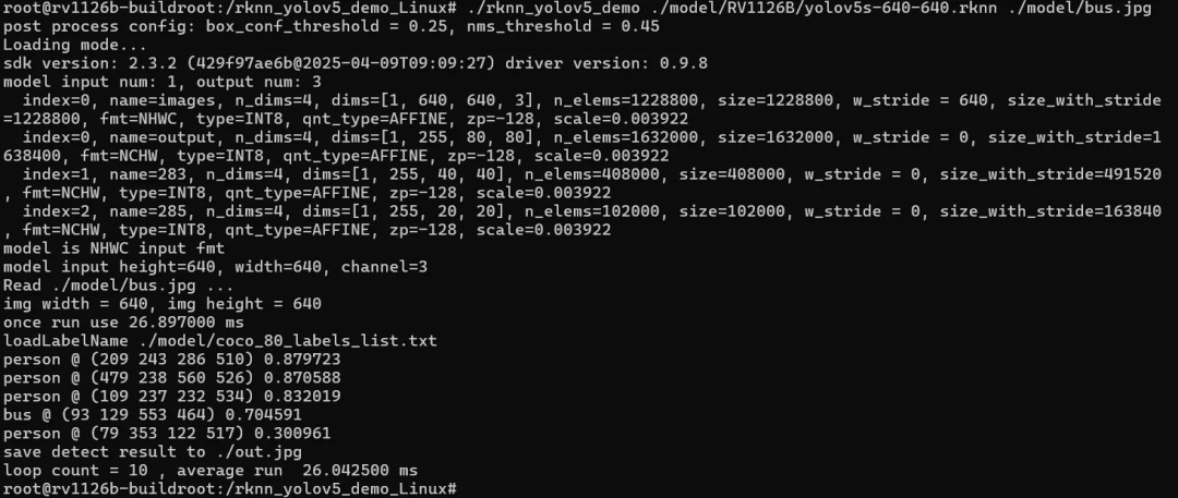 root@rv1126b-buildroot:/# chmod a+x rknn_yolov5_demo root@rv1126b-buildroot:/# ./rknn_yolov5_demo ./model/RV1126B/yolov5s-640-640.rknn ./model/bus.jpg