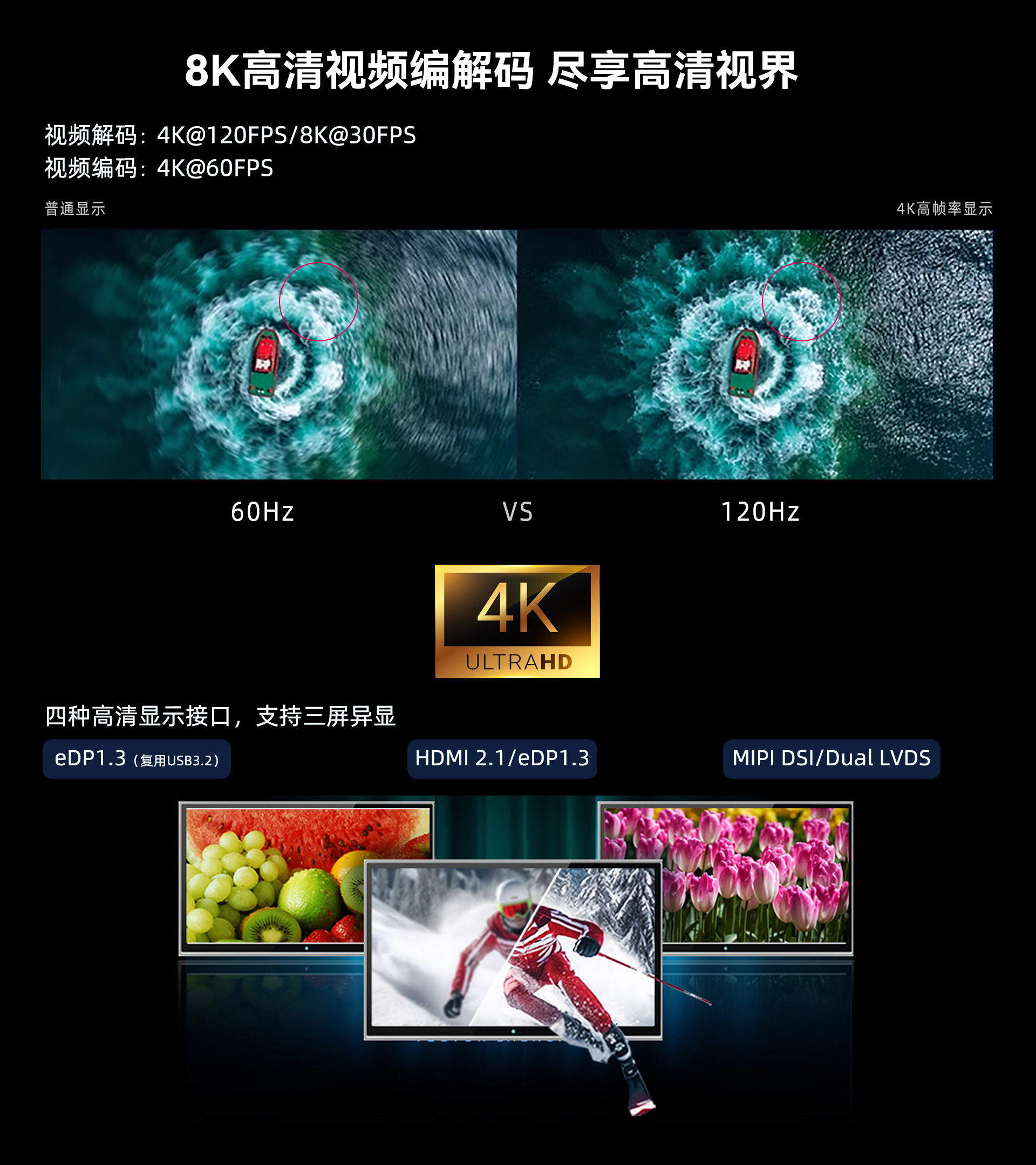 VPU | 视频解码: H.265/HEVC/AVS2/VP9/AV1, 8K@30fps or 4K@120fps H.264/AVC/MJPEG, 4K@60fps 视频编码: H.265/H.264, 4K@60fps MJPEG, 4K@60fps |