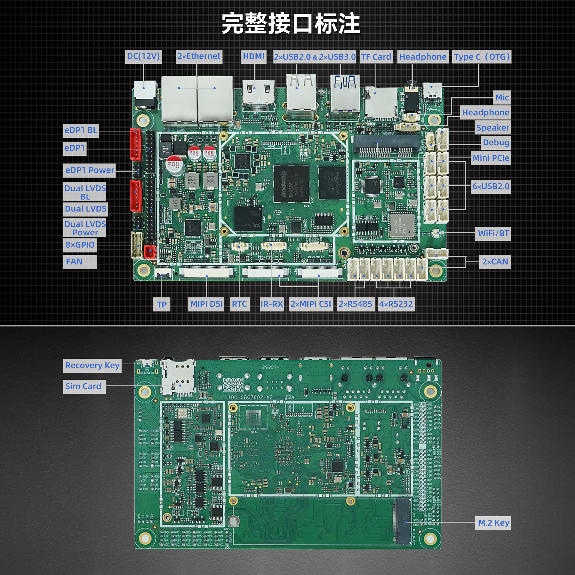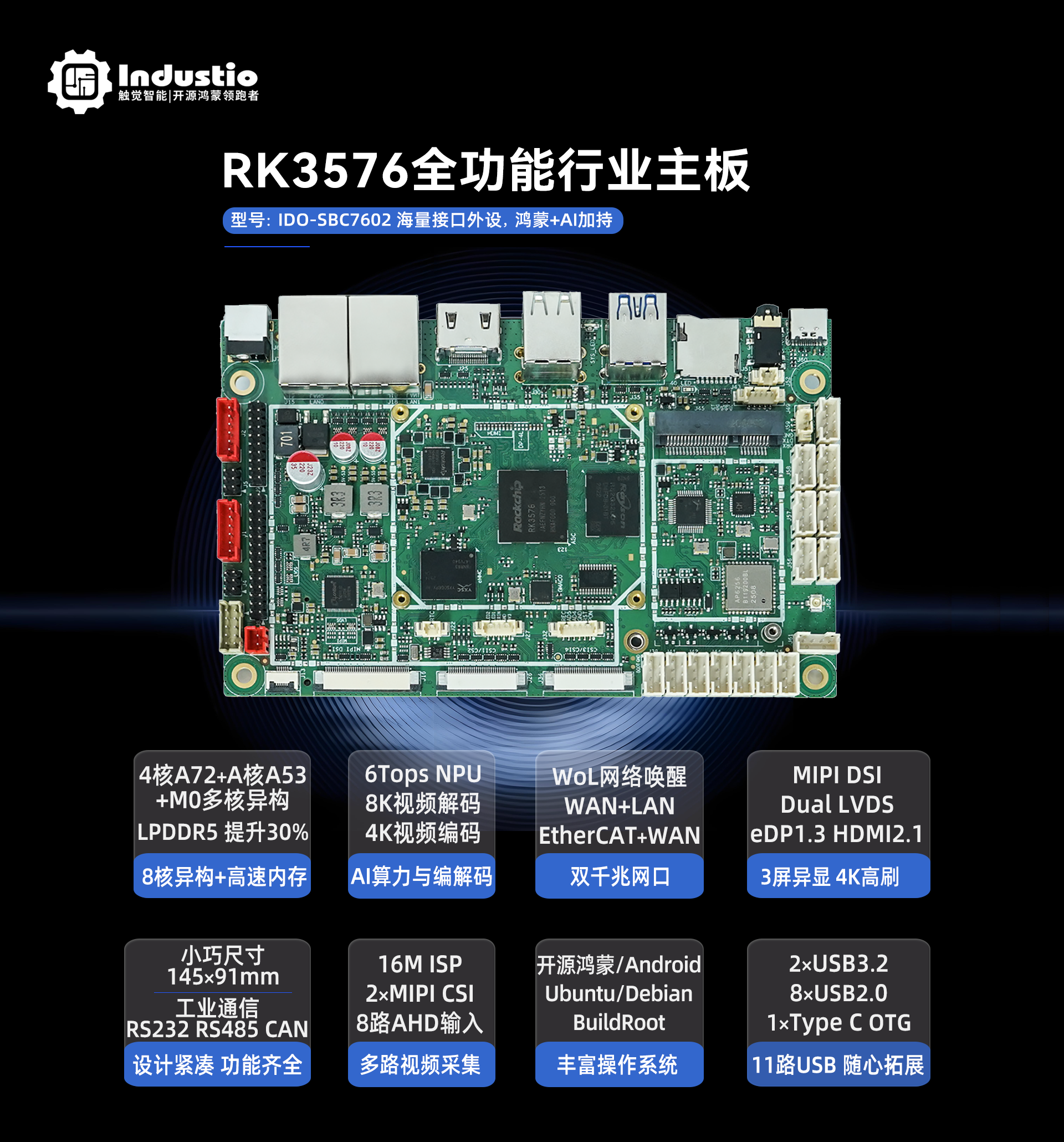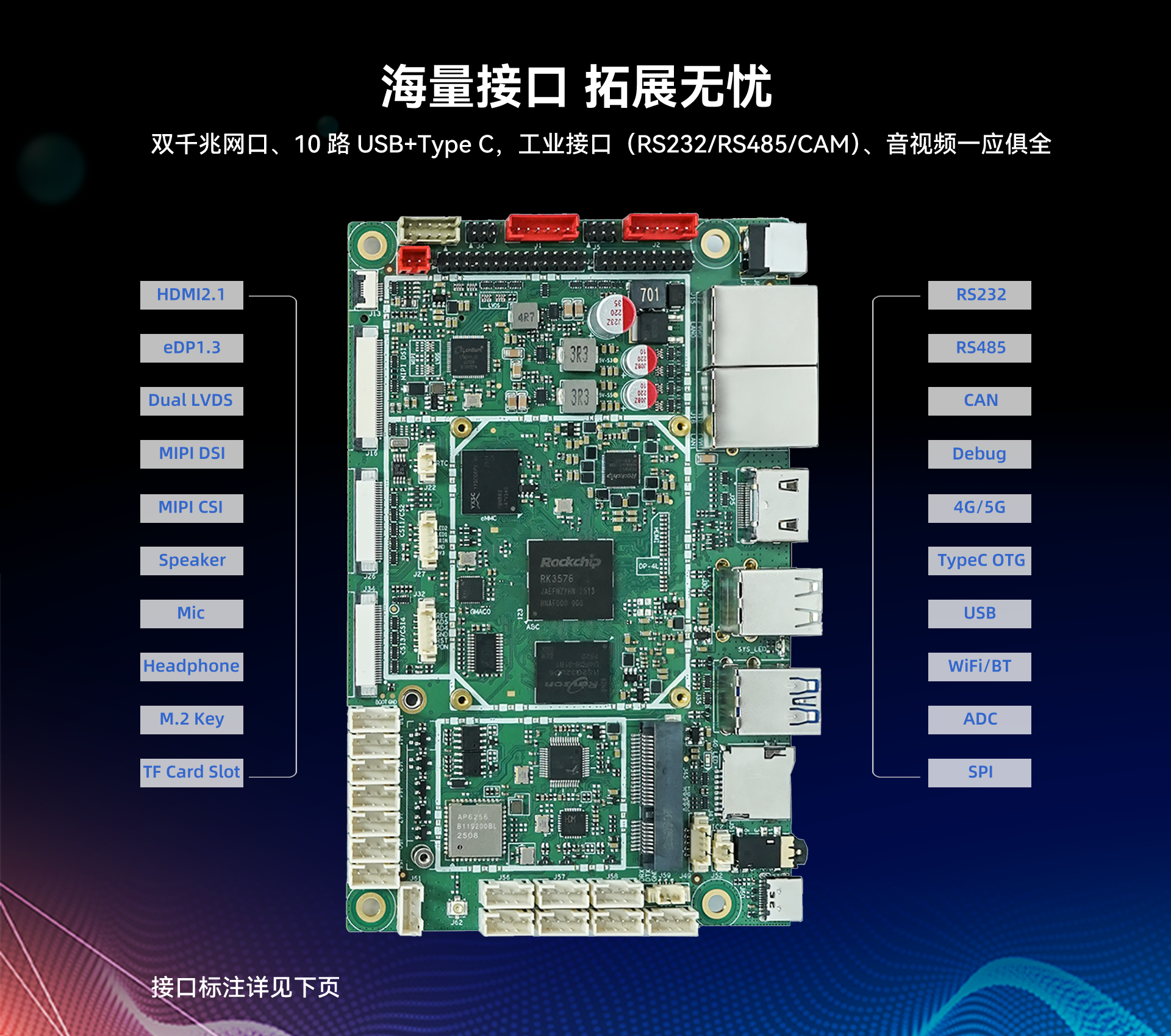 USB | 1 × TypeC OTG(调试+固件下载) 2 × USB3.2 8 × USB2.0 |